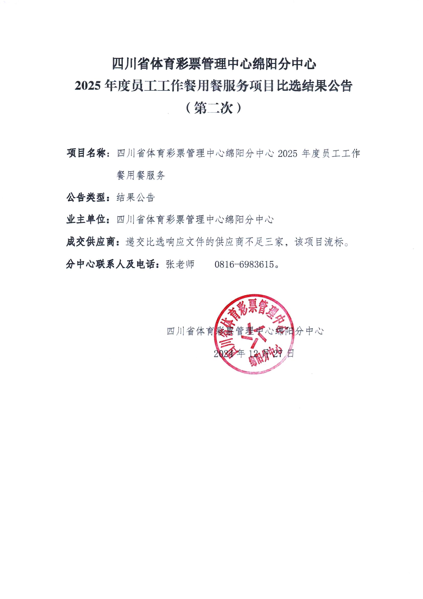 四川省體育彩票管理中心綿陽分中心2025年度員工工作餐用餐服務項目比選結果公告(第二次)