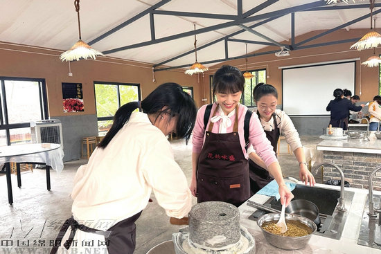 游客在花韻詠盛研學(xué)旅行綜合實踐基地體驗農(nóng)耕文化項目
