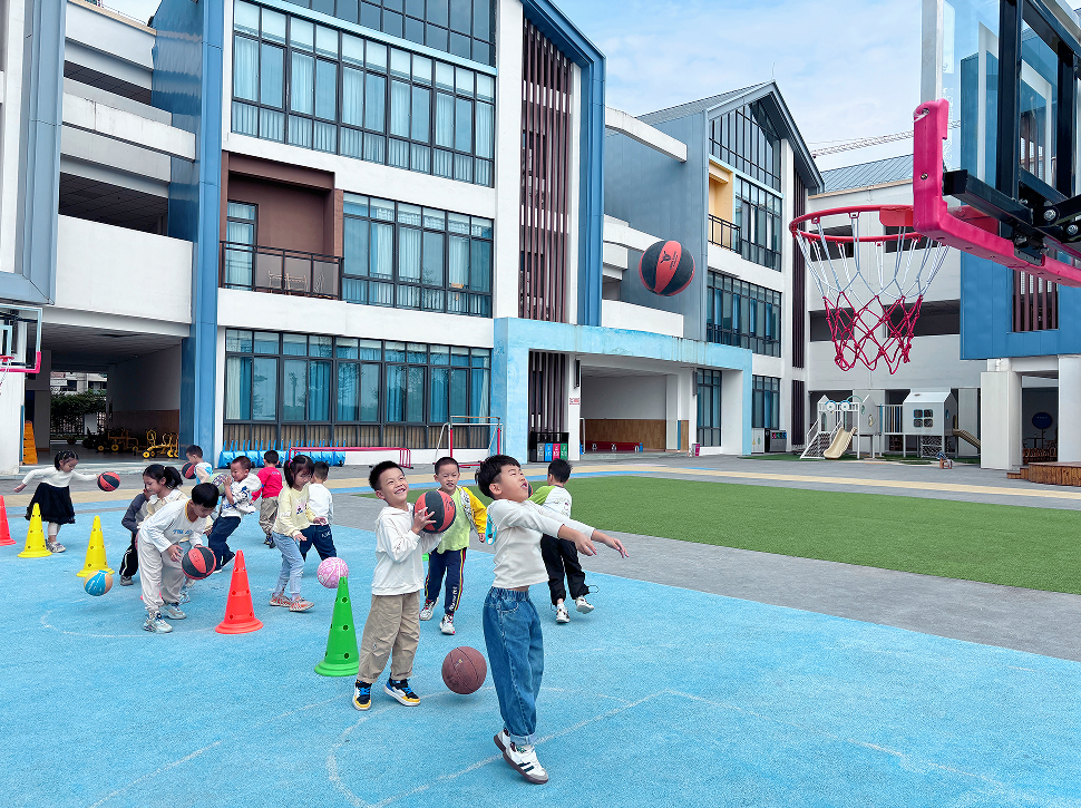 籃球運(yùn)動(dòng)涵蓋了走、跑、跳、投等多種身體運(yùn)動(dòng)形式,能全面、有效、綜合促進(jìn)身體素質(zhì)發(fā)展。老師以游戲的形式開展活動(dòng),重點(diǎn)培養(yǎng)孩子們對籃球的探究興趣,豐富對籃球運(yùn)動(dòng)的動(dòng)作技能。隨著他們肢體控制能力增強(qiáng),籃球技術(shù)內(nèi)容教學(xué)比例逐漸增加,從拍球、傳球、投籃等基本的籃球技術(shù)練習(xí)到多種運(yùn)球、傳球、投籃技術(shù)學(xué)習(xí),從而加強(qiáng)規(guī)則意識、團(tuán)隊(duì)意識、競爭意識的養(yǎng)成,培養(yǎng)他們速度、耐力、靈敏、協(xié)調(diào)性全面發(fā)展。
