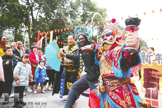 西南科技大學(xué)外籍師生在非遺市集體驗(yàn)川劇變臉
