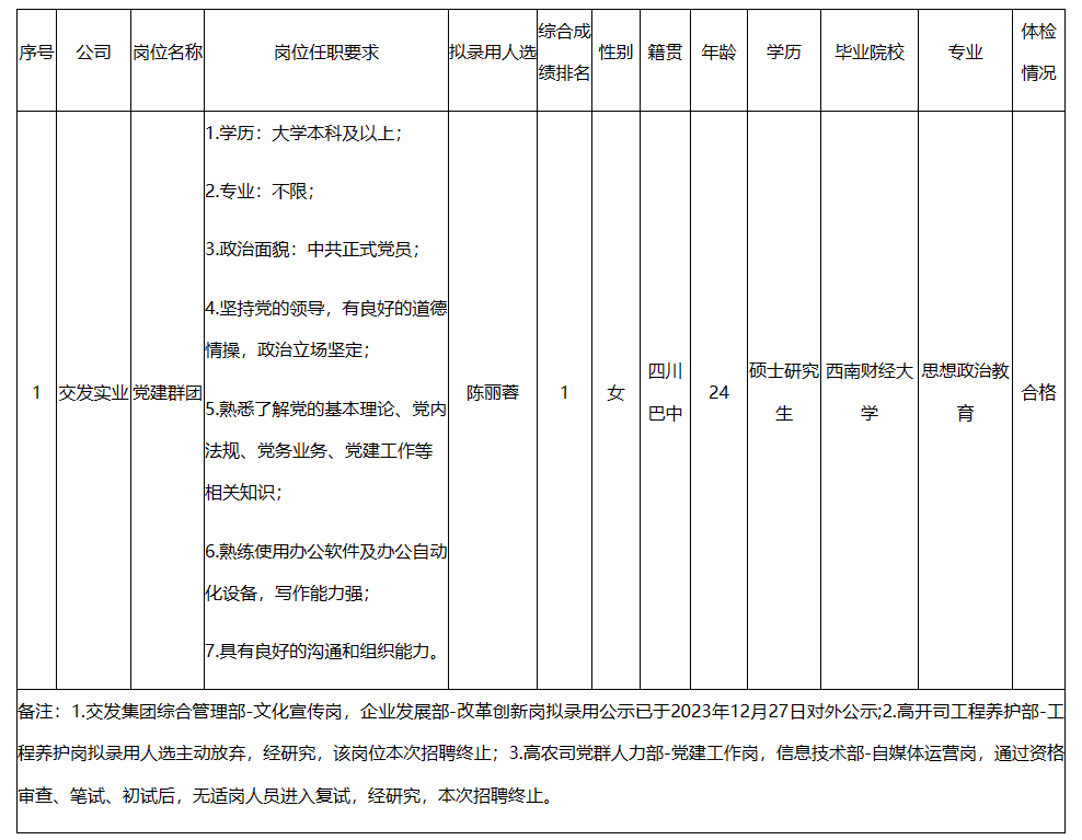根據(jù)交發(fā)集團(tuán)發(fā)布的“獵才行動(dòng)”招聘公告及招聘相關(guān)規(guī)定,經(jīng)資格審查、筆試、面試、背景調(diào)查、體檢等程序,擬錄用陳麗蓉到綿陽交發(fā)實(shí)業(yè)有限責(zé)任公司工作,現(xiàn)予以公示,具體情況如下:
