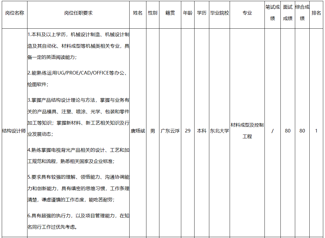 根據(jù)廣東長(zhǎng)虹電子有限公司發(fā)布的招聘公告及招聘相關(guān)規(guī)定,經(jīng)面試等程序,現(xiàn)將面試成績(jī)予以公示。