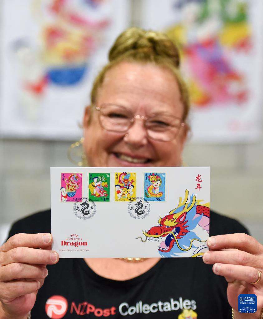 2月3日,在新西蘭奧克蘭,參加“新春花市同樂(lè)日”的新西蘭郵政工作人員向記者展示2024龍年生肖郵票。