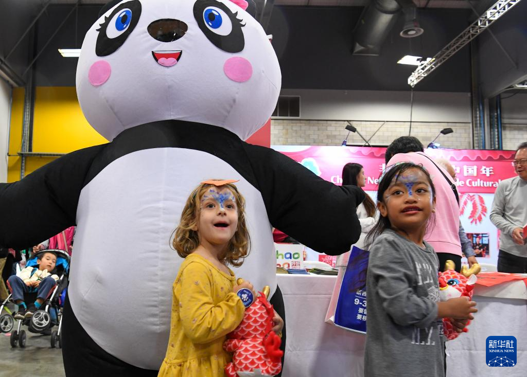 2月3日,在新西蘭奧克蘭,參加“新春花市同樂(lè)日”的小朋友抱著“龍寶寶”走過(guò)一個(gè)“熊貓寶寶”。