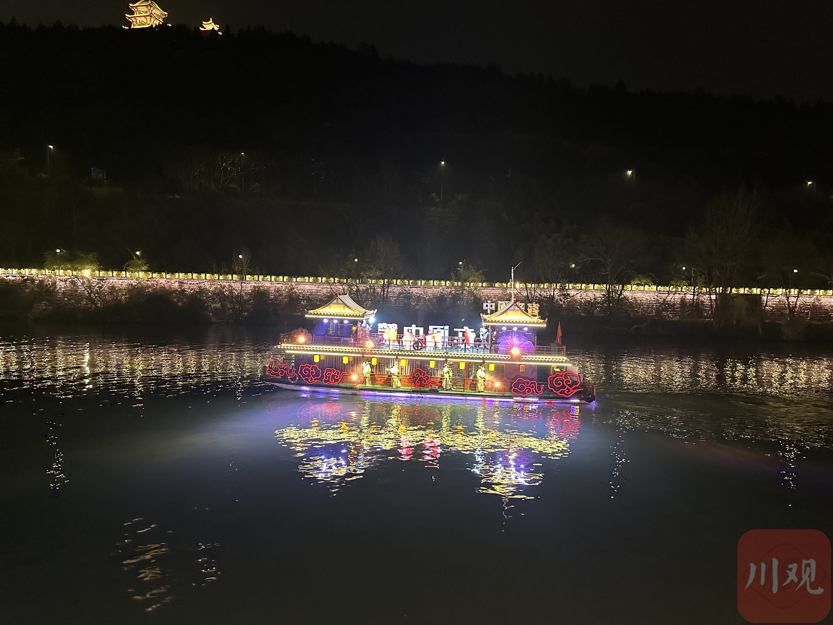 “春節(jié)迎新,今年我們在演出里加入了更多的聲光電表演。”四川閬中水城農業(yè)發(fā)展有限公司董事長沈陽介紹,閬中古城是全國目前保存完好的四大古城之一,游客眾多,為了讓更多的游客留下來,在當?shù)卣闹С窒拢?022年12月,公司推出“客來閬中”環(huán)江實景演藝節(jié)目,環(huán)閬中古城外部水域20公里航線,開展演藝夜游,很快就成為閬中嘉陵江夜游新名片,夏季高峰期場場爆滿,供不應求。