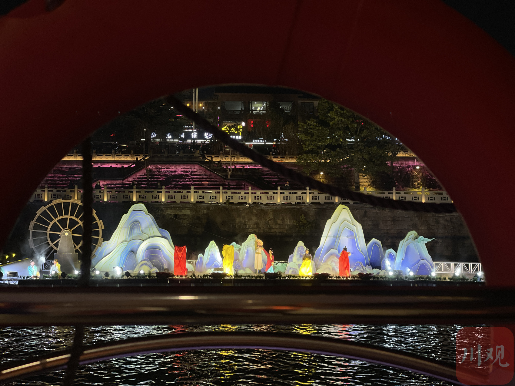 不一會,音樂響起,演出開始了!右側,遠處岸上一輪“圓月”,月亮里人影窈窕,水袖舞動,翩躚裊娜;“月亮”隱去后,一艘演出船從右側趕上與游船平行,燈光乍亮,正戲開場。表演以杜甫、王刺史游覽閬中嘉陵江為主線,隨著游船行進,巧妙穿插進《長安三萬里》詩詞文化元素,輔以江兩岸的燈光,引人入勝。