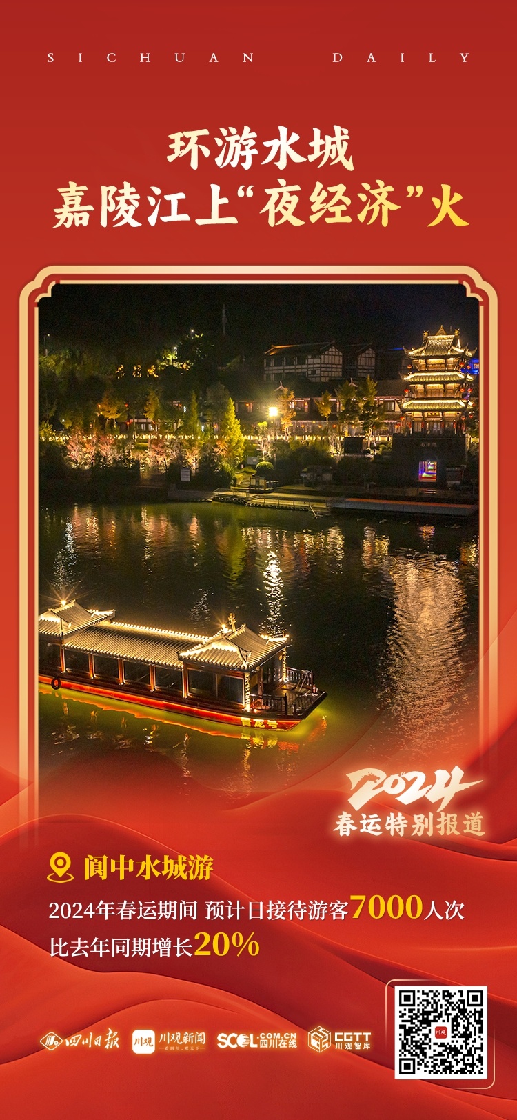 “閬中水城游”2023年接待游客30余萬人次,演藝300余場,讓超2萬游客“留下來”。2024年春運期間預計日均接待游客7000人次,比去年同期增長20%。