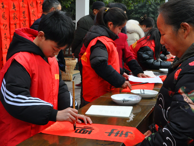 上午 9 點(diǎn),該校黨支部志愿服務(wù)隊黨員志愿者劉華勇帶領(lǐng)五名紅領(lǐng)巾志愿服務(wù)隊來到桑棗鎮(zhèn)文化廣場,他們紛紛揮毫潑墨,用他們精湛的書法技藝寫下了一幅幅喜慶春聯(lián),一副副寓意美好的春聯(lián)、一張張火紅的“福”字躍然紙上,為社區(qū)居民送上了溫暖的節(jié)日祝福。社區(qū)居民紛紛前來領(lǐng)取這些充滿喜慶和祝福的春聯(lián),他們拿著一副副紅紅火火的春聯(lián)和福字,臉上洋溢著幸福的笑容。