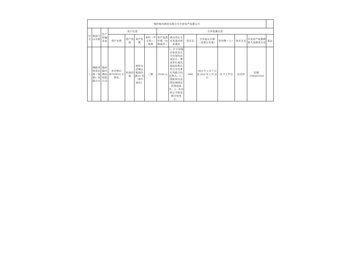 綿陽(yáng)綿州酒店有限公司企業(yè)資產(chǎn)處置公告