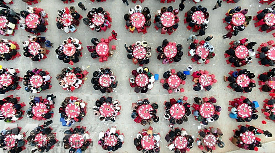 當(dāng)天,記者在梓潼縣自強(qiáng)鎮(zhèn)二洞村看到,2000余村民聚在一起,吃團(tuán)年飯,共度新春。文化廣場上,擺滿了一張張紅色的桌子,燈籠隨處可見,一片喜氣洋洋的節(jié)日氛圍。