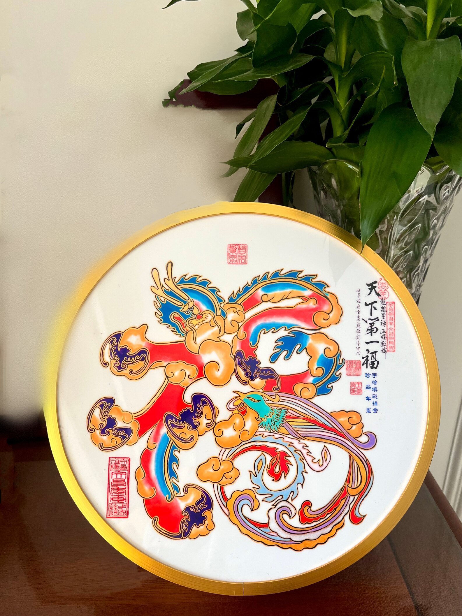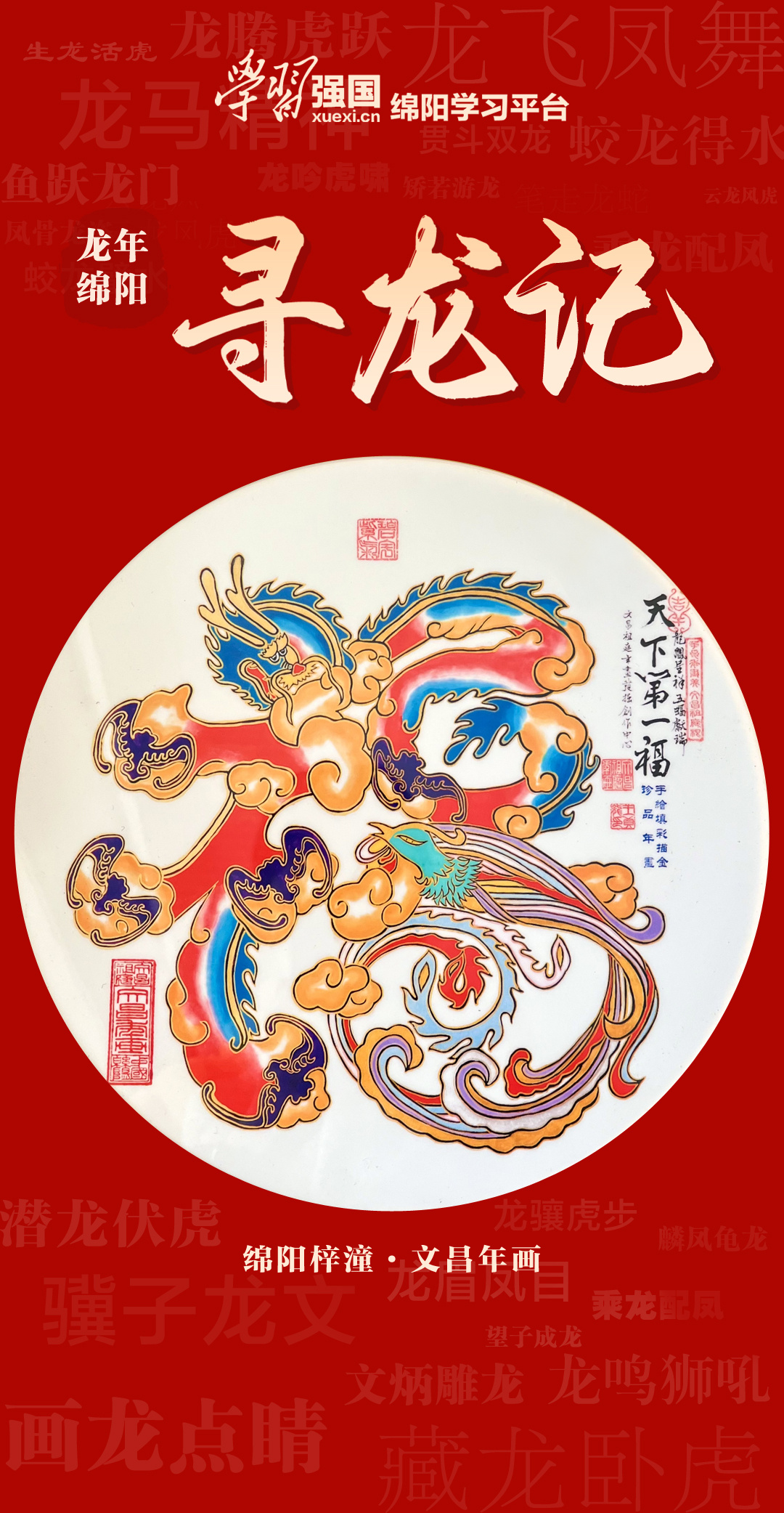 《天下第一?!纺戤嬜髌?,由中華民族的吉祥圖騰如青龍、彩鳳、祥云、金翼紅蝠等為主要元素,通過“文昌年畫”的獨特技法創(chuàng)作而成。作品中的龍與鳳守望相顧,整個畫面形成一個圓形的“福”字,寓意圓滿、團圓、和諧等,祈愿家庭美滿、社會和諧、民族興旺,傳遞國泰民安的大美、大福。