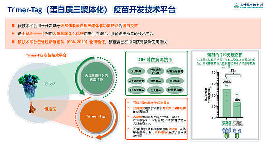 三葉草生物堅持源頭創(chuàng)新,擁有獨創(chuàng)領(lǐng)先的蛋白質(zhì)三聚體化(Trimer-Tag)疫苗研發(fā)平臺,這是全球唯一一個利用人源三聚體化標簽用于生產(chǎn)重組、共價連接抗原的技術(shù)平臺。三葉草生物的技術(shù)平臺已通過其第一個商業(yè)化疫苗產(chǎn)品得到全面驗證,該技術(shù)平臺的適用性還可擴展到其他在研的產(chǎn)品管線。除此之外,三葉草生物擁有已證實的全球疫苗研發(fā)實力,研究經(jīng)驗橫跨五大洲(八個國家),且其擁有廣泛專業(yè)背景的全球科學顧問委員會,為創(chuàng)新型自研管線的研發(fā)注入活力。
