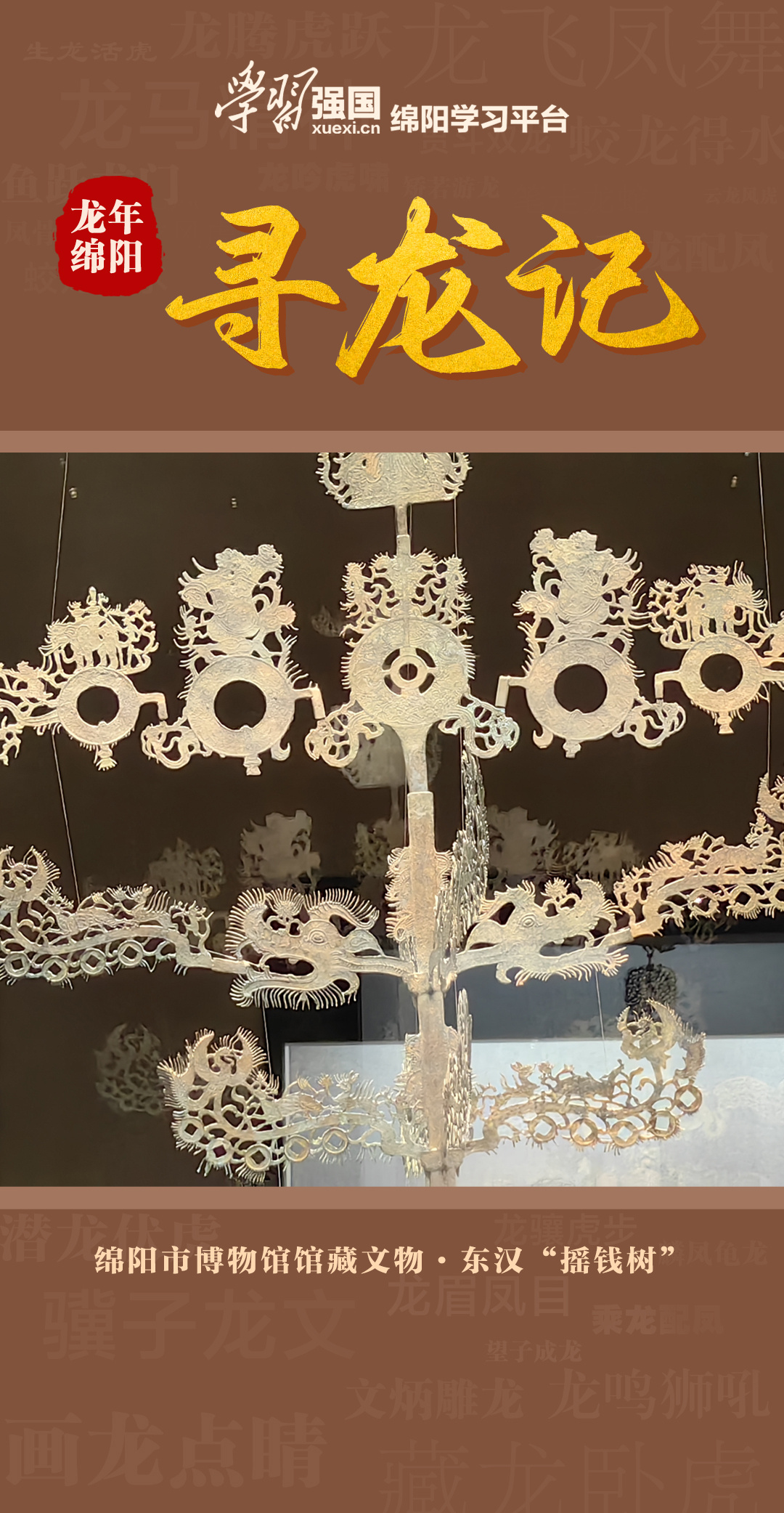 在綿陽市博物館二樓的“富樂夢(mèng)想——綿陽搖錢樹陳列”中,展出了綿陽本地及國內(nèi)其他地方出土的搖錢樹。位于展廳正中的東漢“搖錢樹”,就有龍的裝飾。
