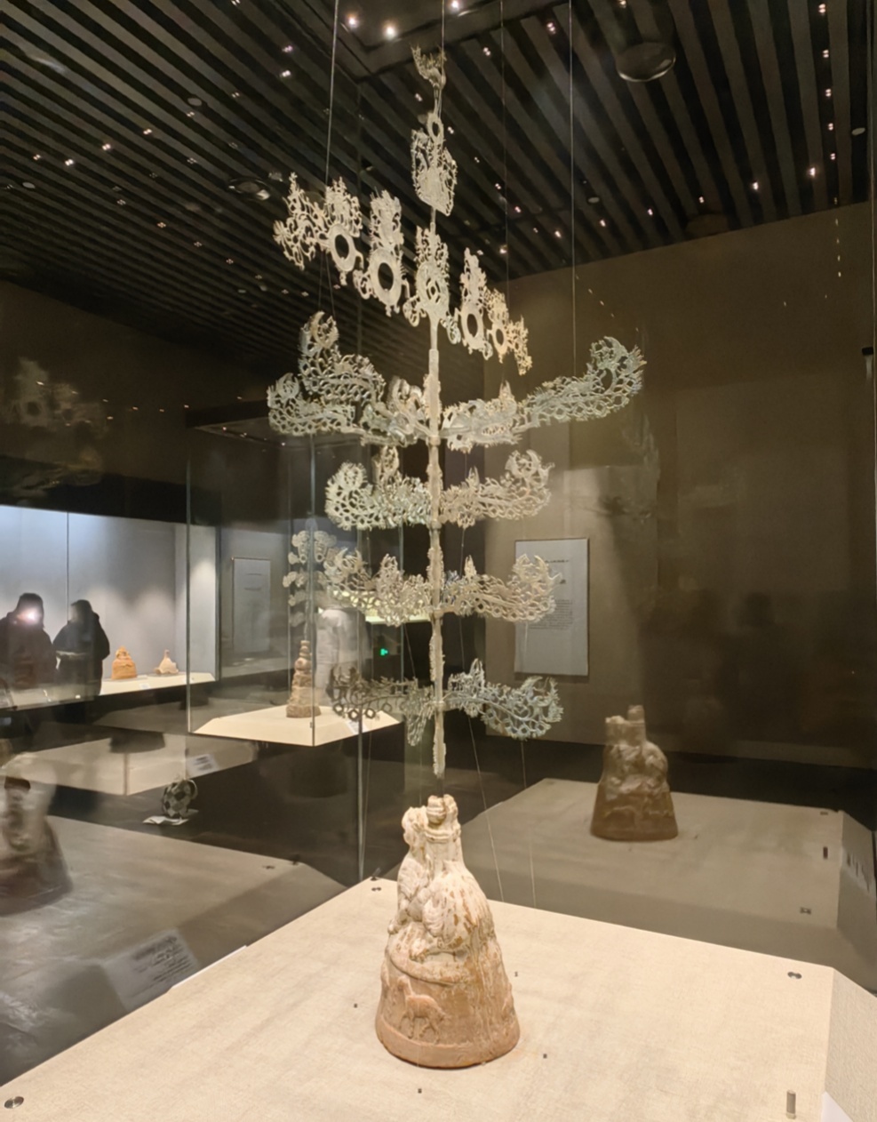 這株東漢“搖錢樹”,1990年出土于綿陽何家山,樹高1.98米,由基座、樹干、枝葉共29種部件連接扣掛而成。它是國內(nèi)保存最完整的搖錢樹中最高大、工藝最復(fù)雜、內(nèi)容最豐富的一株,1996年被定為國家一級(jí)保護(hù)文物,同時(shí)被收錄入《中國文物精華》圖錄。2002年,國家文物局發(fā)布《首批禁止出國(境)展覽文物目錄》,綿陽東漢搖錢樹名列其中。