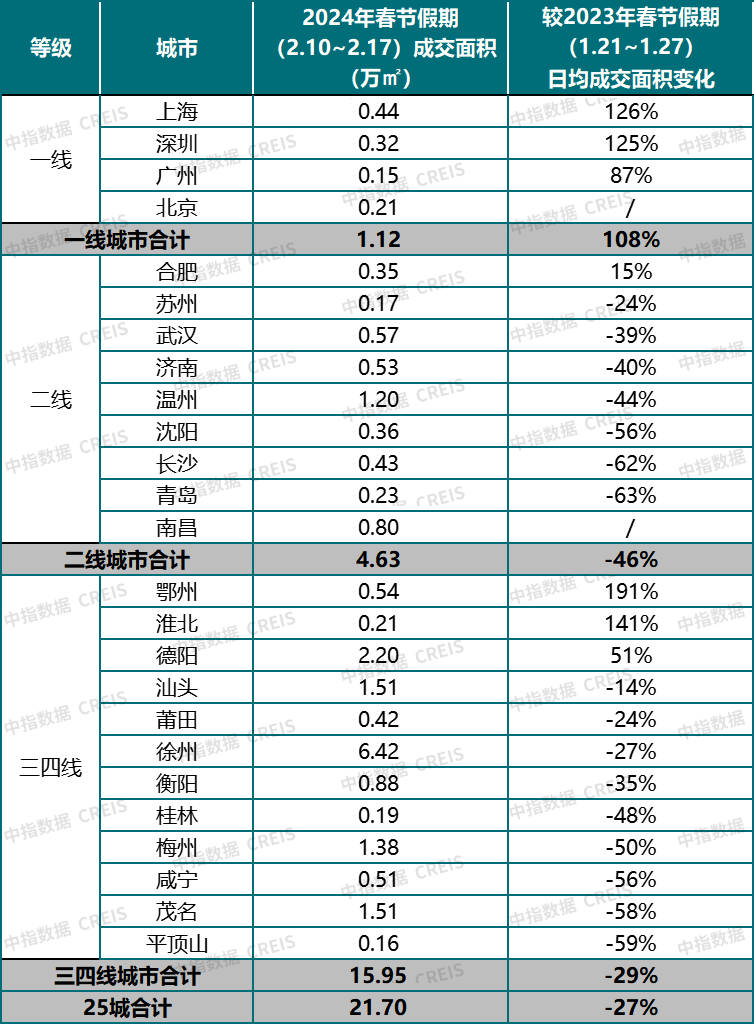 中指研究院的監(jiān)測(cè)數(shù)據(jù)顯示,2024年春節(jié)假期期間(2.10~2.17),25個(gè)代表城市新房日均成交面積較上年春節(jié)假期(2023.1.21~2023.1.27)下降約27%。