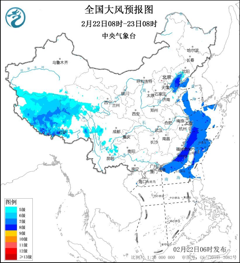 預(yù)計,2月22日08時至23日08時,西藏中西部、青海西南部、遼東半島、云南東部等地的部分地區(qū)有5~6級大風(fēng),陣風(fēng)7~8級;渤海、渤海海峽、黃海西部海域、東海西部海域、臺灣海峽、臺灣以東洋面、南海東北部將有7-8級、陣風(fēng)9級的偏北到東北風(fēng)。