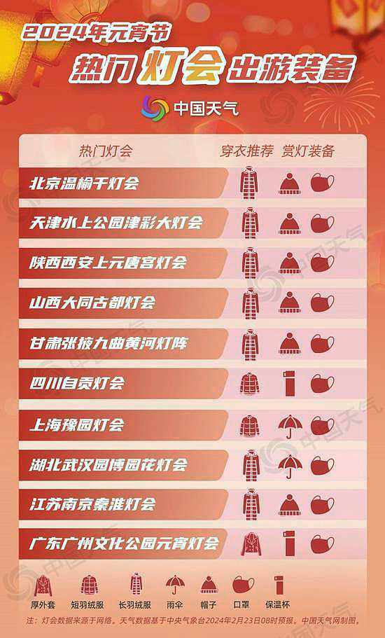 不過花燈雖美,觀賞時也要做好保暖和健康防護(hù)。元宵節(jié)當(dāng)天,北方大部地區(qū)天氣利于賞燈,但最低氣溫普遍在冰點(diǎn)以下,山西大同甚至低于零下10℃,寒意十足,有外出賞燈計劃的朋友建議穿上長款羽絨服保暖;南方體感普遍濕冷,上海、湖北武漢、江蘇南京、四川自貢的朋友也需羽絨服護(hù)體,上海、武漢、南京還將伴有降水,容易出現(xiàn)道路積雪或結(jié)冰現(xiàn)象,待在家中“云賞燈”也是不錯的選擇;廣東廣州體感會舒適很多,全天氣溫都在10℃以上,外出賞燈的朋友穿件厚外套足矣。此外,元宵節(jié)賞燈時人員密集,容易形成交叉感染,建議各位佩戴好口罩,避免扎堆,做好健康防護(hù)和安全工作。