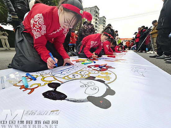 大紅燈籠、可愛的湯圓寶寶、威武雄壯的巨龍、炫彩斑斕的煙花……活動現(xiàn)場,長長的畫卷平鋪開來,來自界牌小學(xué)的33名孩子們身著漢服,正用小手繪制長卷表達對節(jié)日的祝福,對家鄉(xiāng)的熱愛。