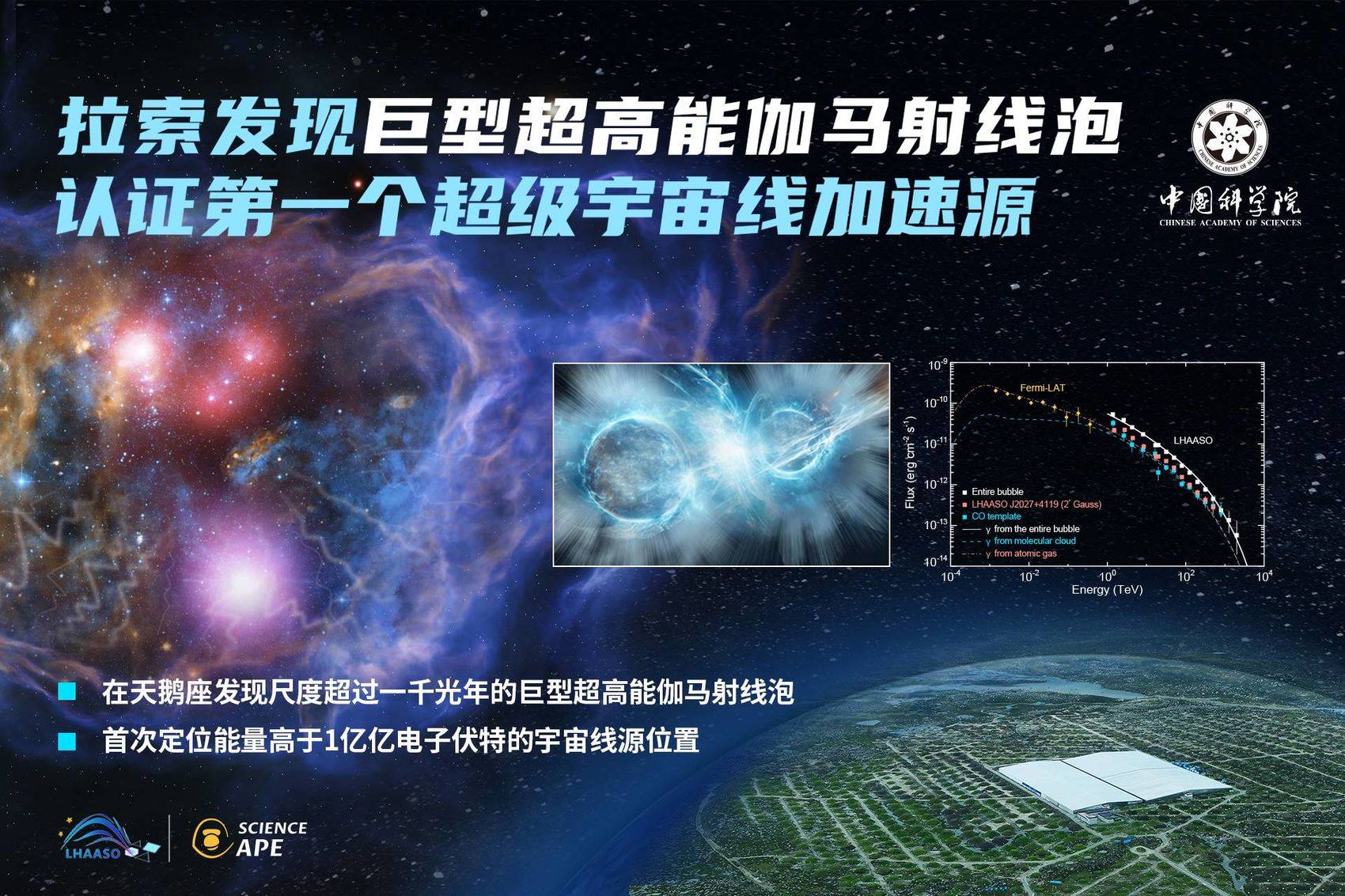 春節(jié)過后,甘孜州稻城縣海拔4410米的海子山上,以宇宙線觀測研究為核心的國家重大科技基礎(chǔ)設(shè)施——高海拔宇宙線觀測站(LHAASO,“拉索”)傳來又一重大發(fā)現(xiàn):在距離地球5000光年左右的天鵝座恒星形成區(qū),發(fā)現(xiàn)了一個巨型超高能伽馬射線泡狀結(jié)構(gòu),是歷史上首次找到能量高于1億億電子伏的宇宙線的起源天體。