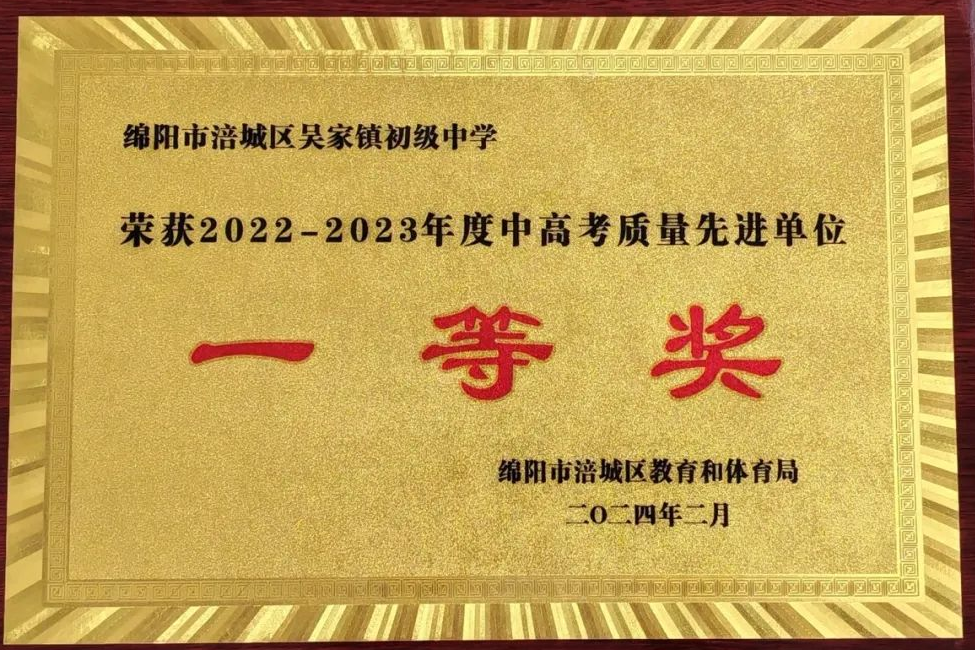 吳家中學榮獲涪城區(qū)2022-2023年度畢業(yè)生就近入學特等獎、綜合績效考核一等獎、教學質(zhì)量一等獎、中考質(zhì)量一等獎!