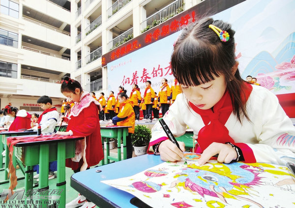綿陽市實(shí)驗(yàn)小學(xué)開學(xué)典禮上,孩子們感受中國傳統(tǒng)文化。(鄧任麗 記者 陳冬冬 攝)