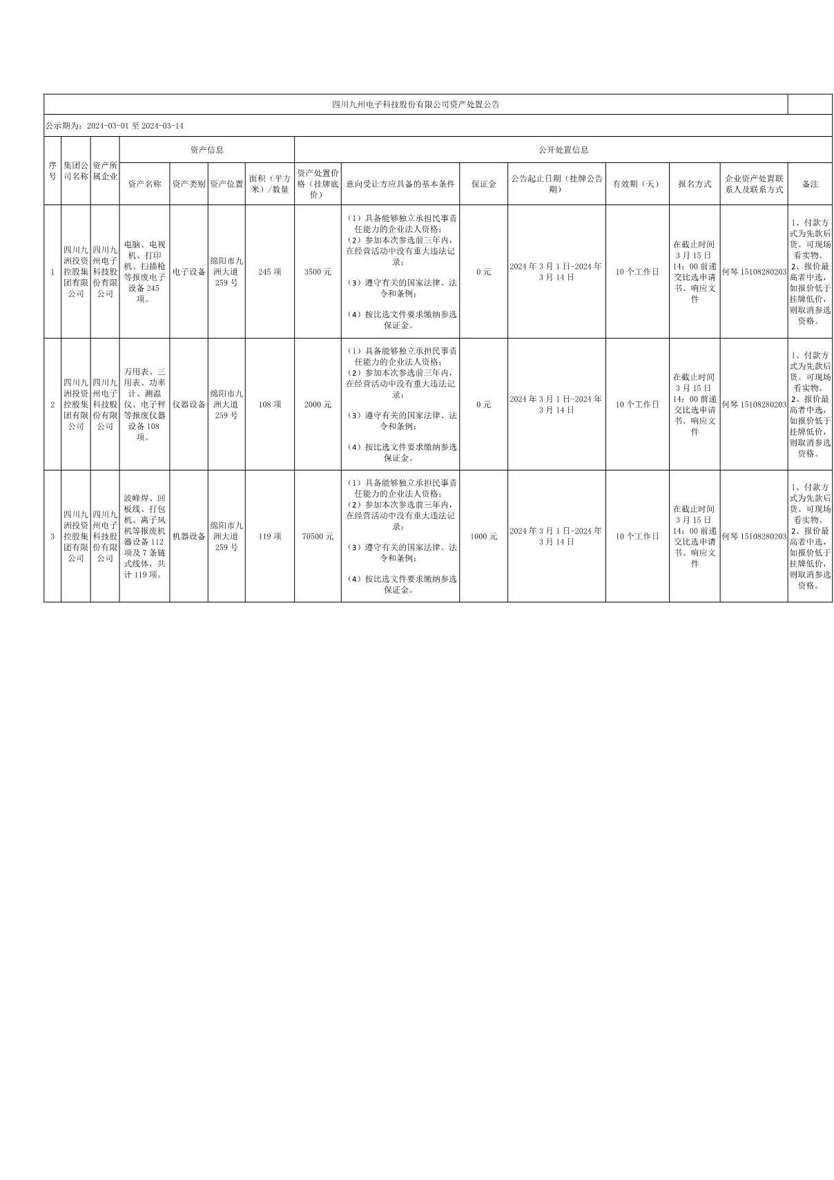 四川九州電子科技股份有限公司資產(chǎn)處置公告