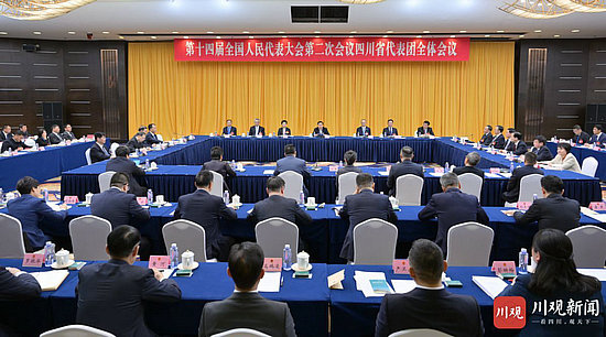 ?。吃拢橙障挛纾诒本┏鱿膶萌珖舜蠖螘h的四川代表團在駐地舉行全體會議。省委書記、省人大常委會主任王曉暉主持會議并講話。