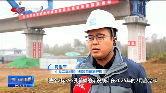 中鐵二局成渝中線項(xiàng)目部 副經(jīng)理 周世軍:按照一天一孔的進(jìn)度正常推進(jìn),整個(gè)2標(biāo)395孔箱梁的架設(shè)預(yù)計(jì)在2025年的7月底完成。整個(gè)成渝中線四川段有6個(gè)架梁標(biāo)段,逐步進(jìn)行預(yù)制和架設(shè)任務(wù)。