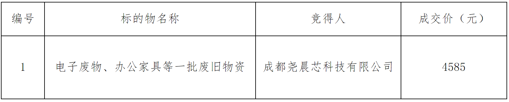經(jīng)綿陽市財政局批準,我中心于2024年3月5日在綿陽市公共資源交易電子交易系統(tǒng)網(wǎng)上競價方式公開處置“電子廢物、辦公家具等廢舊物資”一批,現(xiàn)將成交結(jié)果公示如下: