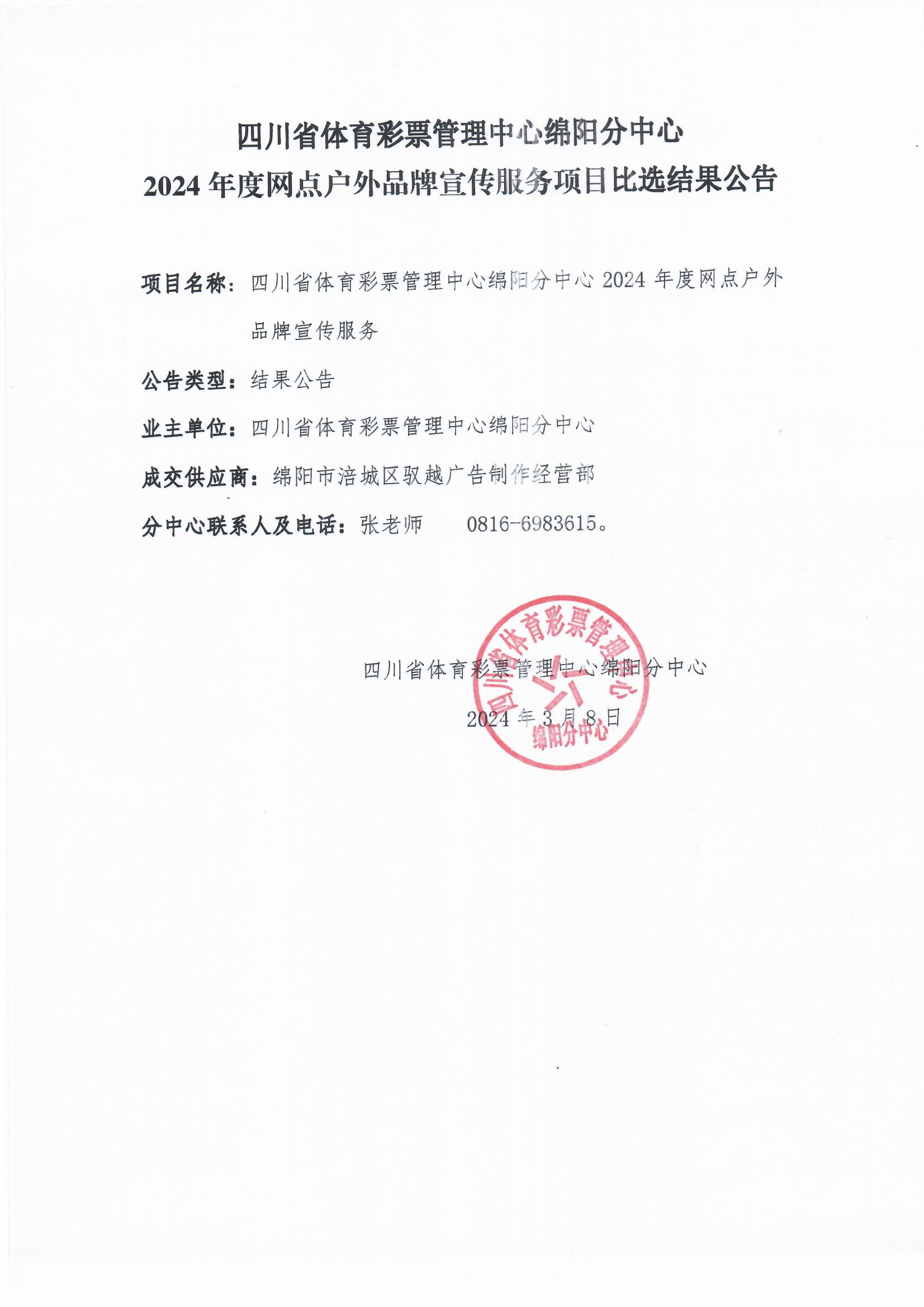 四川省體育彩票管理中心綿陽分中心2024年度網(wǎng)點戶外品牌宣傳服務(wù)項目比選結(jié)果公告