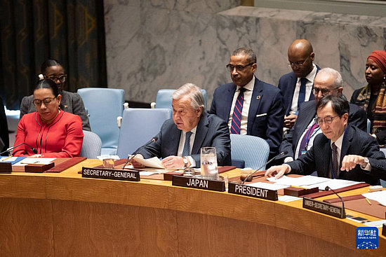 3月7日,在位于紐約的聯(lián)合國總部,聯(lián)合國秘書長古特雷斯(前排中)在安理會蘇丹問題公開會上發(fā)言。新華社記者 謝鍔 攝