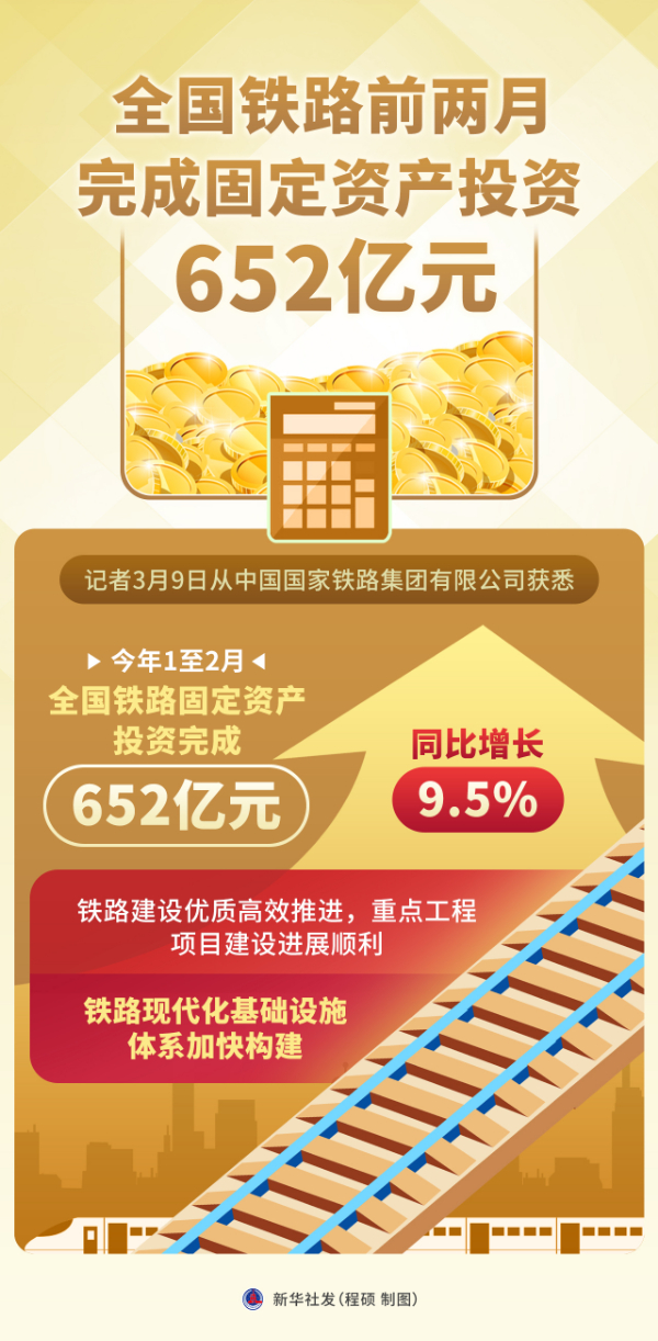 新華社北京3月9日電(記者樊曦)記者9日從中國(guó)國(guó)家鐵路集團(tuán)有限公司獲悉,今年1至2月,全國(guó)鐵路固定資產(chǎn)投資完成652億元,同比增長(zhǎng)9.5%,鐵路建設(shè)優(yōu)質(zhì)高效推進(jìn),重點(diǎn)工程項(xiàng)目建設(shè)進(jìn)展順利,鐵路現(xiàn)代化基礎(chǔ)設(shè)施體系加快構(gòu)建。