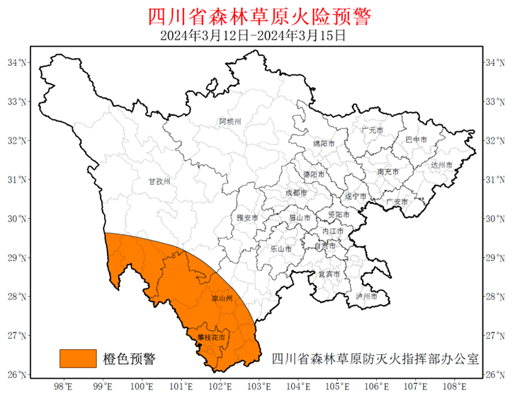 經(jīng)省森防指辦公室與省林草局、四川氣象局及相關地區(qū)會商,預計3月12日—15日攀枝花市,甘孜州西南部,涼山州西部、中部和南部(涉及17個縣級行政單位,具體范圍見附件)森林草原火險等級將維持在高度危險級別,特發(fā)布高森林草原火險橙色預警。