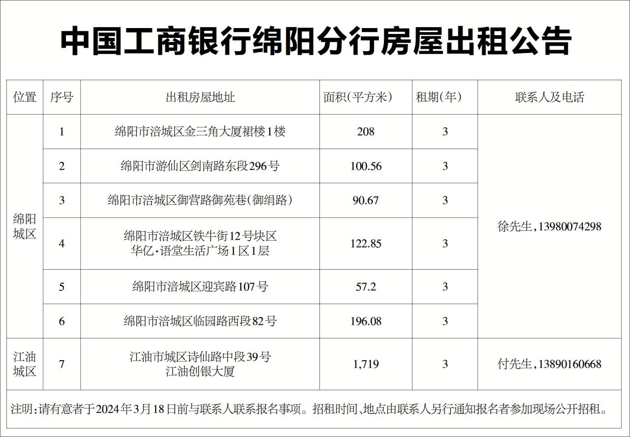 中國工商銀行綿陽分行房屋出租公告