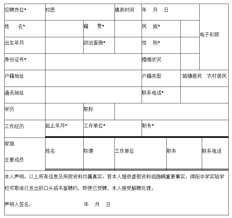 2.報名方式:凡符合招聘條件的人員請于截止日期之前將應聘人員報名表和個人簡歷情況發(fā)送至郵箱:3133842870@qq.com(生活老師、清潔工)、519122254@qq.com(校醫(yī)),或前往綿陽中學實驗學校政教處現(xiàn)場報名,報名時間以收到郵件或填寫報名表時間為準。
