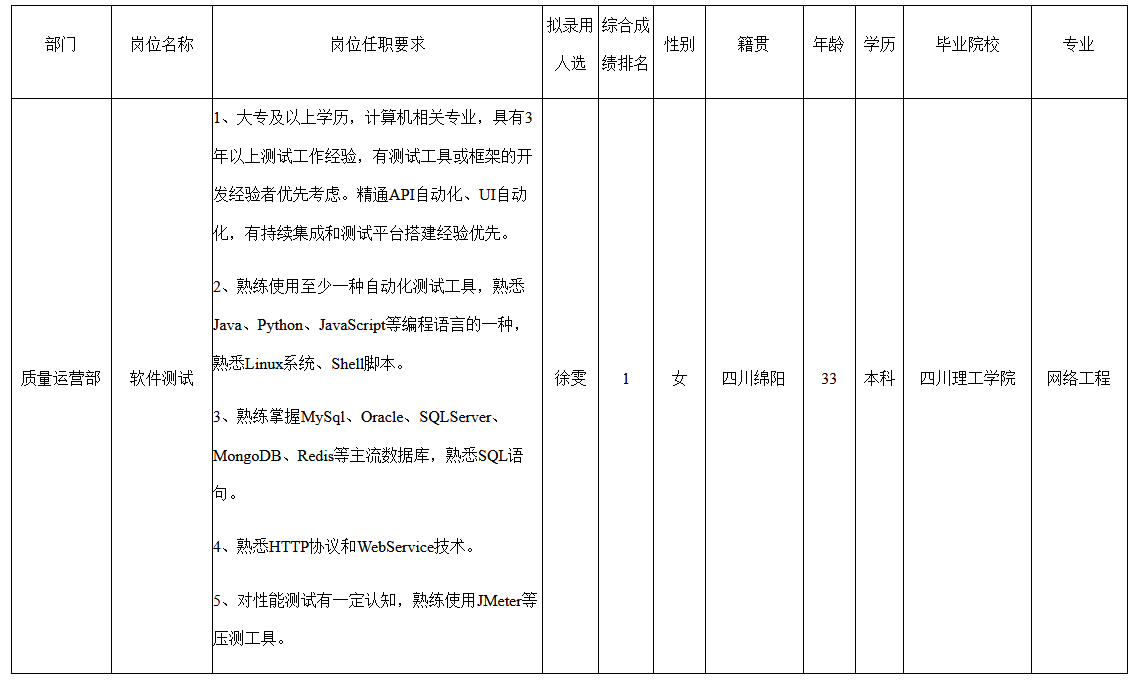 根據(jù)四川華豐科技股份公司發(fā)布的招聘公告及招聘相關(guān)規(guī)定,經(jīng)筆試、面試、考察、體檢等程序,擬錄用徐雯等同志到四川華豐科技股份有限公司工作,現(xiàn)予以公示,具體情況如下:
