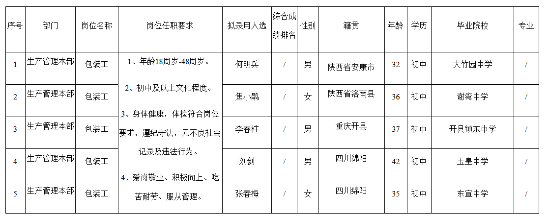 根據(jù)四川長虹新能源科技股份有限公司發(fā)布的招聘公告及招聘相關(guān)規(guī)定,經(jīng)面試、體檢等程序,擬錄用何明兵等5名同志到四川長虹新能源科技股份有限公司工作,現(xiàn)予以公示,具體情況如下: