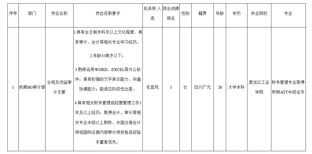 根據(jù)四川長(zhǎng)虹置業(yè)有限公司2024年1月2日發(fā)布的招聘公告及招聘相關(guān)規(guī)定,經(jīng)資源BG審計(jì)分部初試、集團(tuán)審計(jì)部復(fù)試和考察等程序,擬錄用任顯鳳同志到資源BG審計(jì)分部工作,現(xiàn)予以公示,具體情況如下: