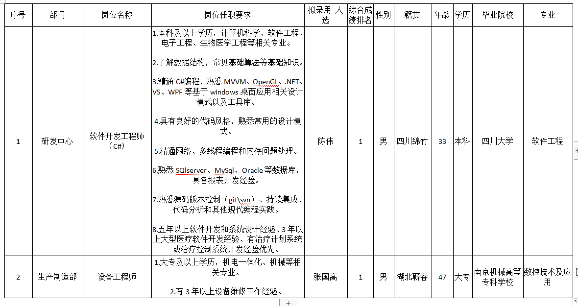 根據(jù)中玖閃光醫(yī)療科技有限公司發(fā)布的招聘公告及招聘相關(guān)規(guī)定,經(jīng)過篩選、面試、體檢等程序,擬錄用陳偉、張國高等同志到中玖閃光醫(yī)療科技有限公司工作,現(xiàn)予以公示,具體情況如下: