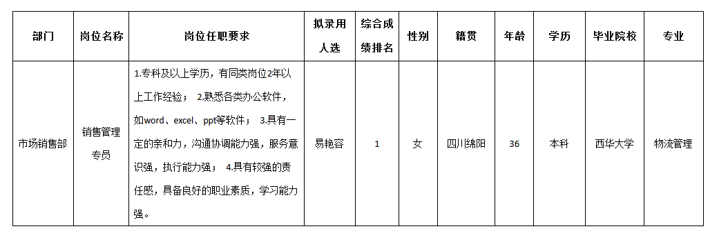 根據(jù)四川九洲光電科技股份有限公司發(fā)布的招聘公告及招聘相關(guān)規(guī)定,經(jīng)筆試、面試、考察、體檢等程序,擬錄用易艷容同志到四川九洲光電科技股份有限公司工作,現(xiàn)予以公示,具體情況如下: