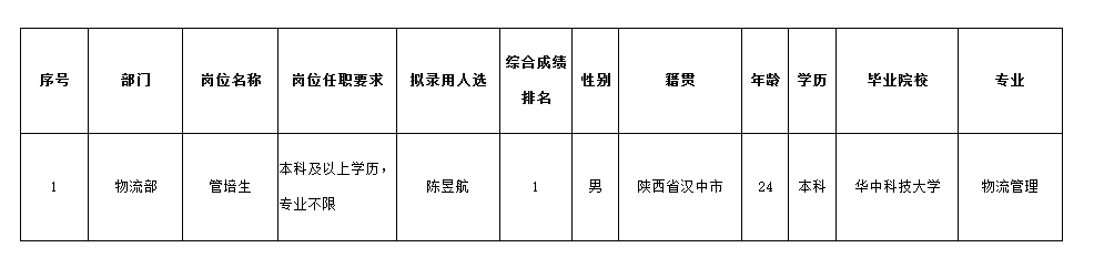 根據(jù)四川波鴻實業(yè)有限公司發(fā)布的招聘公告及招聘相關(guān)規(guī)定,經(jīng)面試等程序,擬錄用以下人員為威斯卡特工業(yè)(中國)有限公司管培生,現(xiàn)予以公示,具體情況如下: