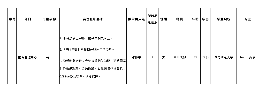 根據(jù)四川波鴻實業(yè)有限公司發(fā)布的招聘公告及招聘相關規(guī)定,經面試等程序,擬錄用以下人員為四川波鴻實業(yè)有限公司會計,現(xiàn)予以公示,具體情況如下: