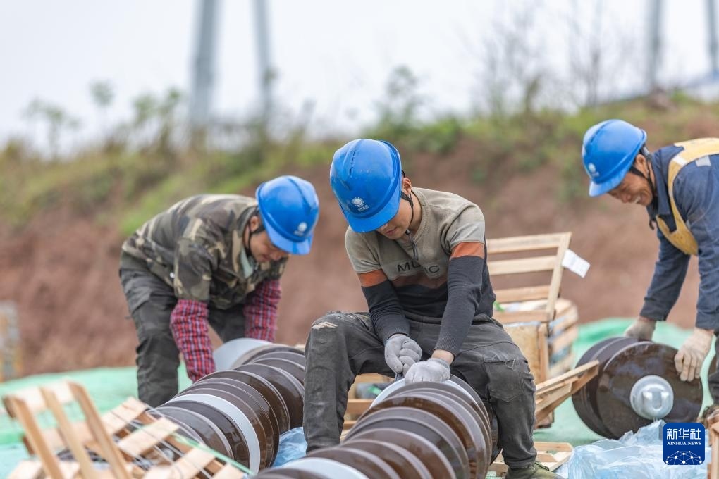 3月17日,施工人員在位于重慶市銅梁區(qū)少云鎮(zhèn)的川渝1000千伏特高壓交流工程施工現(xiàn)場(chǎng)作業(yè)。