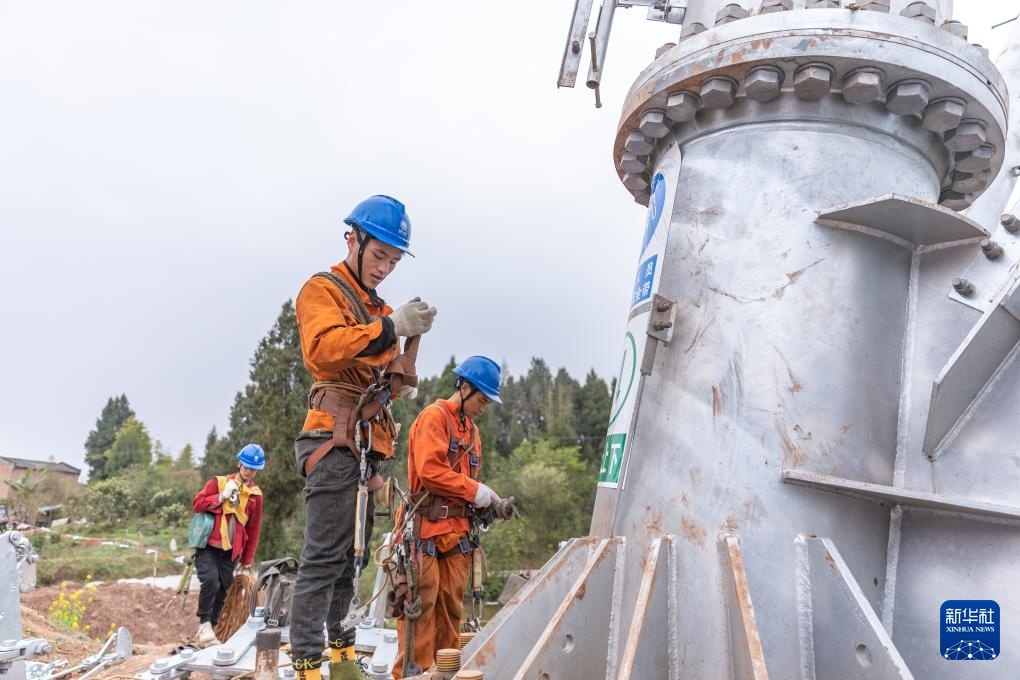 3月17日,在位于重慶市銅梁區(qū)少云鎮(zhèn)的川渝1000千伏特高壓交流工程施工現(xiàn)場(chǎng),施工人員準(zhǔn)備登塔作業(yè)。
