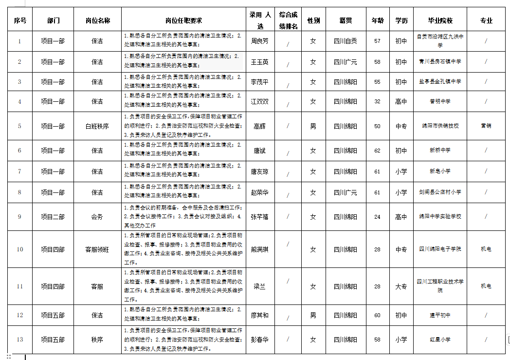 根據(jù)綿陽市康來物業(yè)服務(wù)有限公司發(fā)布的招聘公告及招聘相關(guān)規(guī)定,經(jīng)面試、試用等程序,錄用以下人員到綿陽市康來物業(yè)服務(wù)有限公司各項目部工作,現(xiàn)予以公示,具體情況如下: