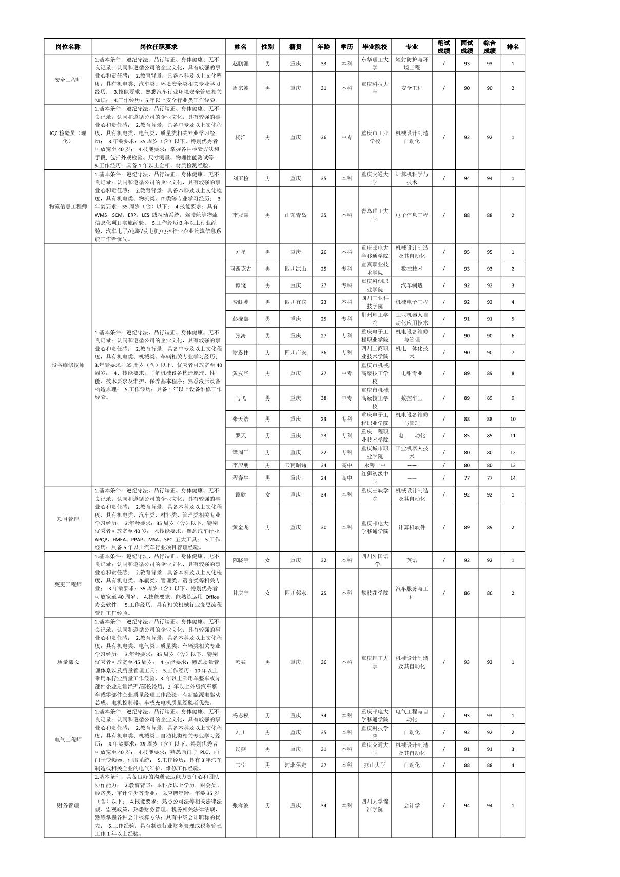根據(jù)重慶九州智造科技有限公司發(fā)布的招聘公告及招聘相關(guān)規(guī)定,經(jīng)筆試、面試等程序,現(xiàn)將筆試(面試)成績(jī)予以公示。