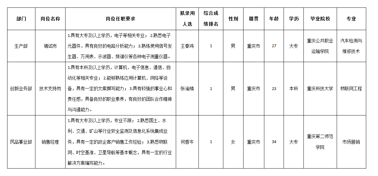 根據(jù)重慶九州星熠導(dǎo)航設(shè)備有限公司發(fā)布的招聘公告及招聘相關(guān)規(guī)定,經(jīng)筆試、面試、考察、體檢等程序,擬錄用張渝楠,何香岑,王春鴻同志到重慶九州星熠導(dǎo)航設(shè)備有限公司工作,現(xiàn)予以公示,具體情況如下:
