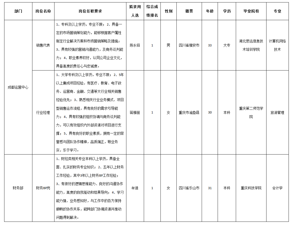 根據(jù)四川科瑞軟件有限責(zé)任公司發(fā)布的招聘公告及招聘相關(guān)規(guī)定,經(jīng)筆試、面試、考察、體檢等程序,擬錄用蔣雅麗,陳永鐸,牟迪同志到四川科瑞軟件有限責(zé)任公司工作,現(xiàn)予以公示,具體情況如下: