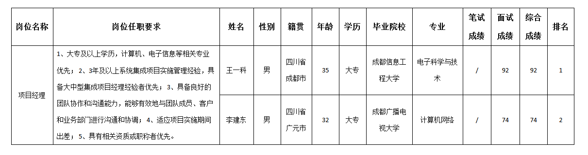 根據(jù)四川科瑞軟件有限責(zé)任公司發(fā)布的招聘公告及招聘相關(guān)規(guī)定,經(jīng)筆試、面試等程序,現(xiàn)將筆試(面試)成績(jī)予以公示。