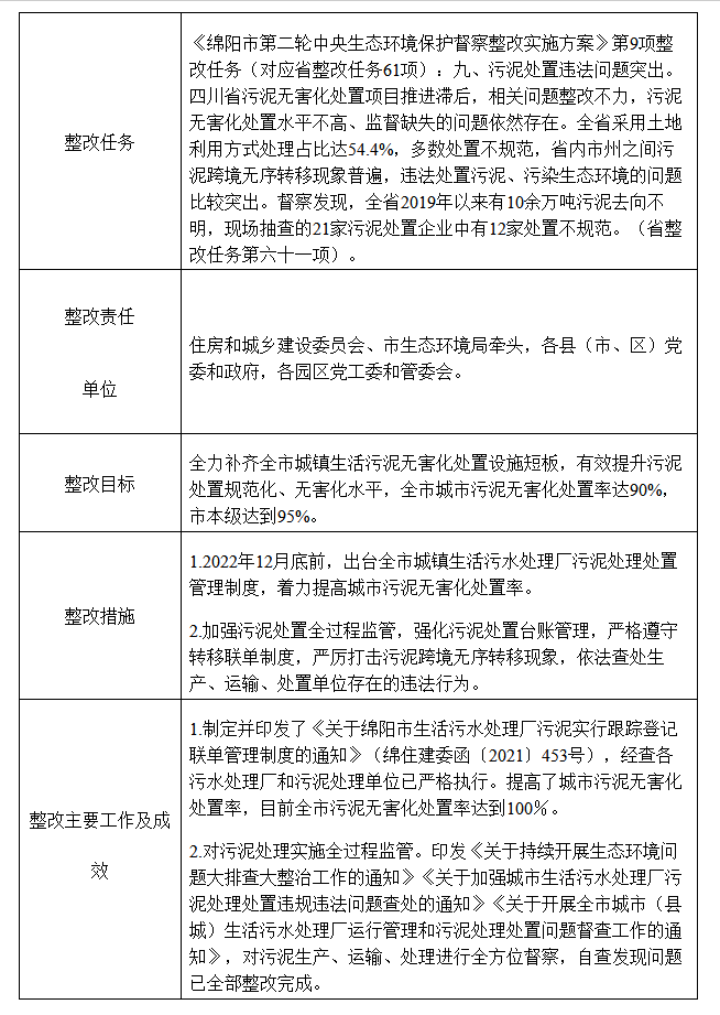 根據(jù)《四川省生態(tài)環(huán)境保護督察問題整改銷號辦法(2023年修訂)》有關(guān)要求,綿陽市第二輪中央生態(tài)環(huán)境保護督察第九項(對應(yīng)省整改任務(wù)第六十一項)整改任務(wù)已整改完成,并通過驗收,擬按程序?qū)嵤╀N號?,F(xiàn)將該項問題整改驗收情況予以公示,公示期為2024年3月18日至3月29日。公示期間如有異議,請實名書面向綿陽市住房和城鄉(xiāng)建設(shè)委員會提出。聯(lián)系電話:0816-2224488;郵寄地址:綿陽市園藝山云泉南街2號集中辦公區(qū)6A。